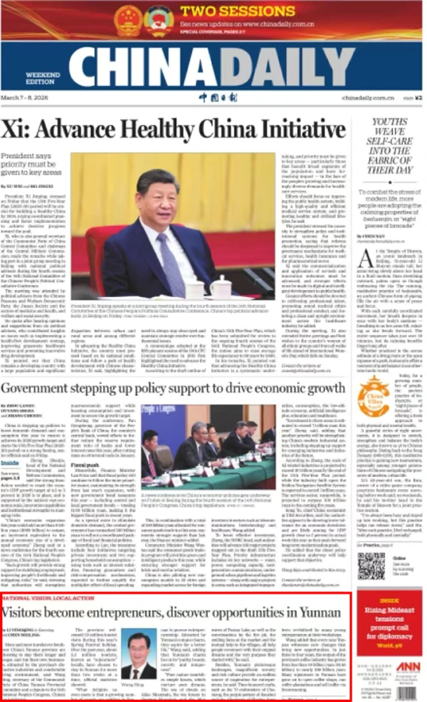 《中国日报》今日头版“中国式现代化的地方实践”高端访谈栏目推出全国人大代表、云南省委书记王宁专访报道 Visitors become entrepreneurs,discover opportunities in Yunnan(《来云南旅居,创一番锦绣事业》)。