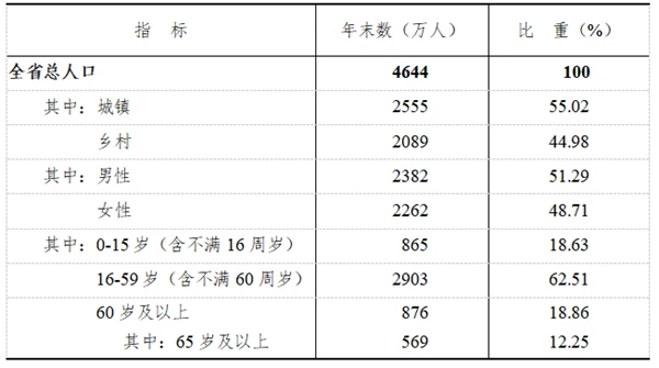 年末全省常住人口4644万人,其中城镇人口2555万人,乡村人口2089万人。全年出生人口34.7万人,出生率为7.46‰;死亡人口40.5万人,死亡率为8.71‰;自然增长率为-1.25‰。年末全省城镇化率55.02%,比上年末提高0.91个百分点。年末全省户籍人口4839.52万人,比上年末减少15.96万人。