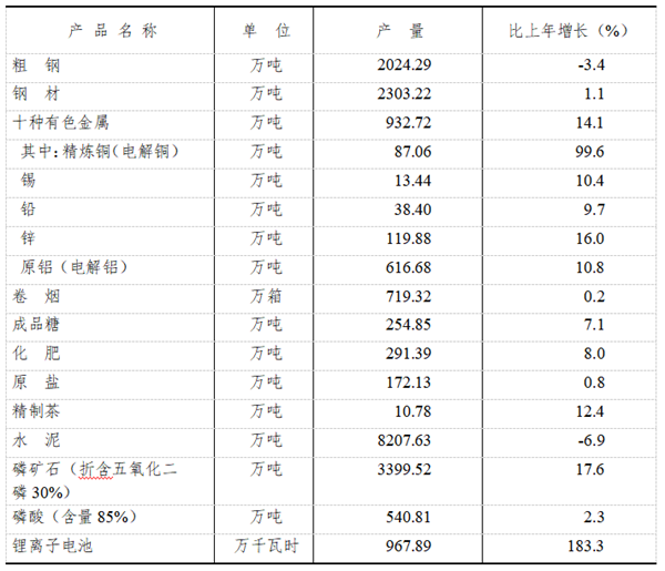 全年全部工业增加值7629.19亿元,比上年增长4.2%。规模以上工业[6] 增加值增长4.5%。从三大板块看,烟草、能源、非烟非能工业增加值分别增长1.3%、2.7%、8.1%。从三大门类看,采矿业,制造业,电力、热力、燃气及水生产和供应业增加值分别增长7.1%、4.6%、3.6%。从主要行业看,化学原料和化学制品制造业增加值增长3.4%,非金属矿物制品业增加值下降3.1%,黑色金属冶炼和压延加工业增加值下降1.1%,有色金属冶炼和压延加工业增加值增长14.2%,电气机械和器材制造业增加值增长8.5%,电力、热力生产和供应业增加值增长3.8%。