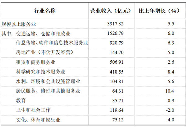 全年规模以上服务业[7] 营业收入3917.32亿元,比上年增长5.5%。现代服务业发展良好,规模以上多式联运和运输代理业、装卸搬运和仓储业营业收入分别增长37.7%、23.1%。