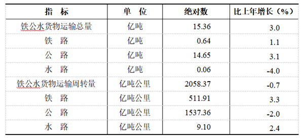 全年铁路、公路、水路货物运输总量15.36亿吨,比上年增长3.0%,货物运输周转量2058.37亿吨公里,下降0.7%。民用航空货邮吞吐量49.48万吨,增长8.4%。