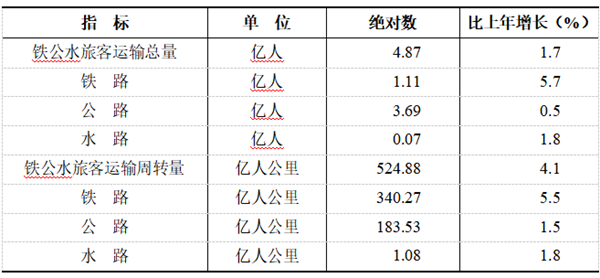 全年铁路、公路、水路旅客运输总量4.87亿人,比上年增长1.7%。旅客运输周转量524.88亿人公里,增长4.1%。民用航空旅客吞吐量7589.87万人,增长6.2%。