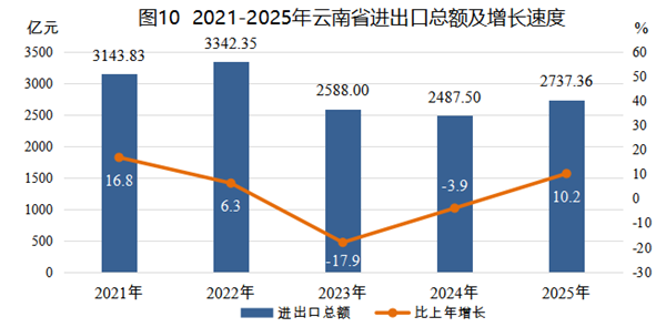 全年外贸进出口总额2737.36亿元,比上年增长10.2%。其中,出口总额941.08亿元,增长1.9%;进口总额1796.28亿元,增长15.1%。中老铁路“黄金大通道”作用持续发挥,全年经中老铁路进出口货物544.1万吨,增长13.9%,货值达266.8亿元,增长42.9%。