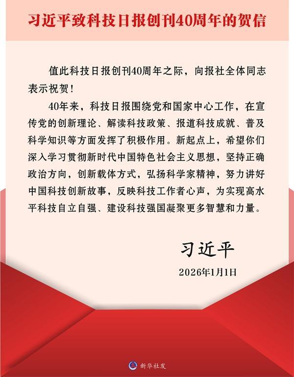 在科技日报创刊40周年之际,中共中央总书记、国家主席、中央军委主席习近平发来贺信,向报社全体同志表示祝贺。