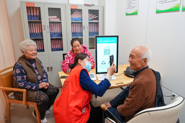 2025年10月23日,老人们在山东省淄博市张店区马尚街道金石社区日间护理中心测量健康数据。新华社记者 朱峥 摄
