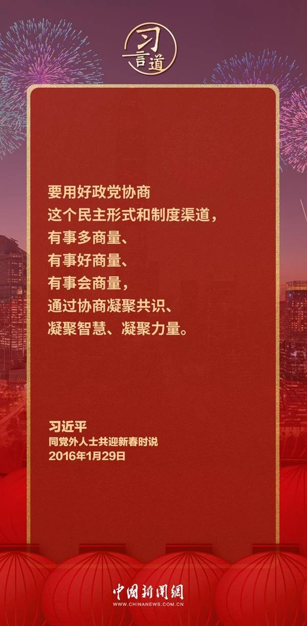 习近平总书记高度重视统一战线工作,连续多年同党外人士共迎新春,强调有事多商量、有事好商量、有事会商量。